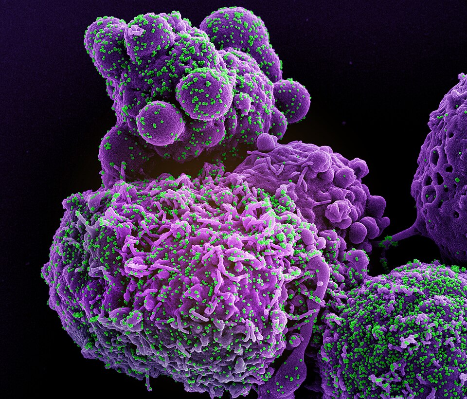 Цветна сканираща електронна микрография на клетка (лилаво), заразена с щама Omicron на вирусни частици SARS-CoV-2 (зелено) (Credit: NIAID, CC BY 2.0,