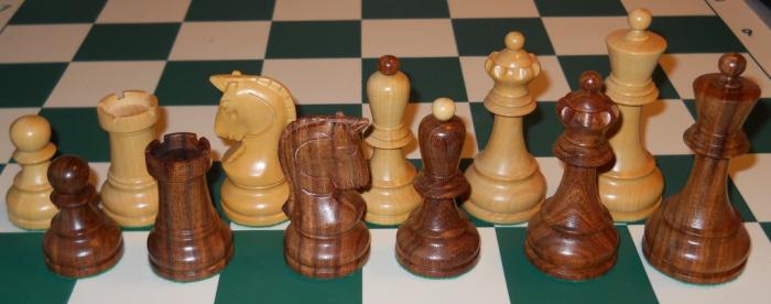 Дървените бели шахматни фигури обикновено се изработват от светло дърво, чемшир или понякога клен. Черните дървени парчета са изработени от тъмно дърво като палисандрово дърво, абанос, червено сандалово дърво, африканско падук дърво (африкански падук, който е подобен на червеното сандалово дърво и се продава като палисандрово дърво (Bud Rosewood или Blood Red Rosewood)) или орех. Понякога се изработват от чемшир и се байцват или боядисват в черно, кафяво или червено. Конете в дървените комплекти обикновено са ръчно издълбани, което представлява половината от цената на комплекта. Пластмасовите бели части са направени от бяла или почти бяла пластмаса, а пластмасовите черни части са направени от черна или червена пластмаса. Понякога се използват други материали, като кост, слонова кост или композитен материал.