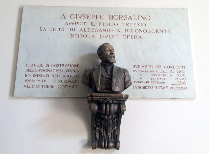 Възпоменателен плоча на Джузепе Борсалино за приноса му в изграждането на осветлението на Алесандрия. (Photo: Brigante mandrogno, CC BY-SA 4.0, via Wikimedia Commons)