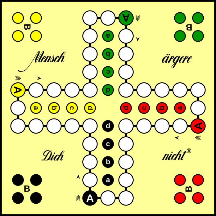 На игралната дъска за максимум четирима души, четирите различно оцветени начални квадрата (обикновено червено, черно, зелено и жълто) са маркирани в ъглите, всеки с четири позиции (брой игрални фигури на играч). Полето A („Начало“ (също S-поле („Старт“); вижте Фигура 2) маркира началната позиция на новопоставена игрална фигура, когато се хвърли шестица. Стрелката показва посоката на движение. След едно завъртане, игралната фигура трябва да се премести до четирите съответно оцветени целеви квадрата. Полето за шест души е проектирано по подобен начин.
