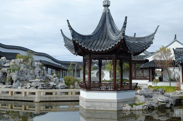 Павилион „Сърцето на езерото“ и мост в Китайската градина в Дънидин, Нова Зеландия, 2013 (Credit: Pseudopanax at English Wikipedia, Public domain, via Wikimedia Commons)
