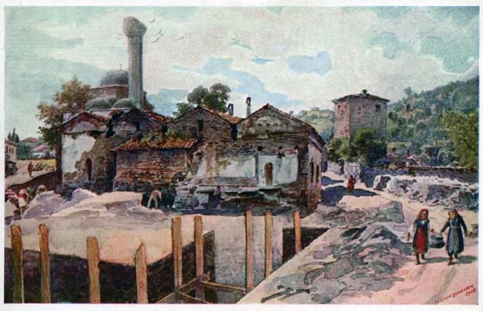 Вероятно работейки по кадастъра на квартал „Банишора“, той е открил място с добра перспектива към града. Наблюдателното око на художника забелязва останките на крепостната стена на Сердика и по тях с въображение прави въстановка на Улпия Сердика и на северната порта на града. С поглед от там са два панорамни акварела на София към юг до планината Витоша. Единият ни представя София през 1877 г., като на преден план се виждат стари гробища, а другият е от 1907 г. и вече личат новите квартали с улици и булеварди и модерни сгради. При съпоставката на двете картини промяната в пейзажа е видима и впечатляваща.
