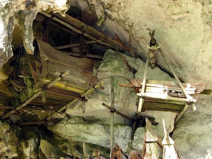Тези висящи ковчези са закрепени под надвеса на скалната стена в пещерата Лонда Нангала в Сулавеси. (Credit: Michael Gunther, CC BY-SA 4.0, via Wikimedia Commons)