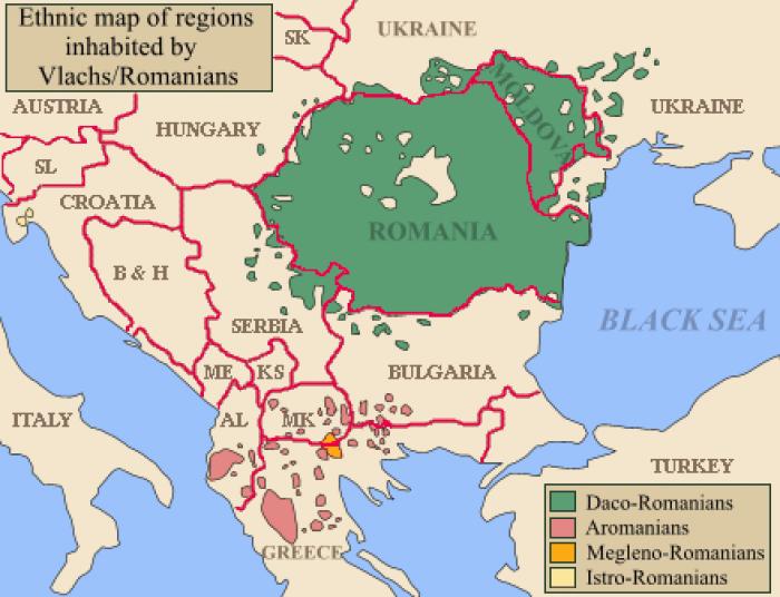 Областите на разпространение на 4-те балкански романски (влашки) езици. (Credit: Olahus, CC BY-SA 3.0 , via Wikimedia Commons)