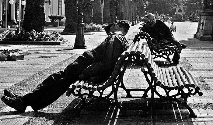 Мъже спят през деня в град Ла Коруня, Испания (Credit: Julio Rojas ; cropped by Before My Ken 14:48, 13 April 2009 (UTC), CC BY-SA 2.0, via Wikimedia Commons)