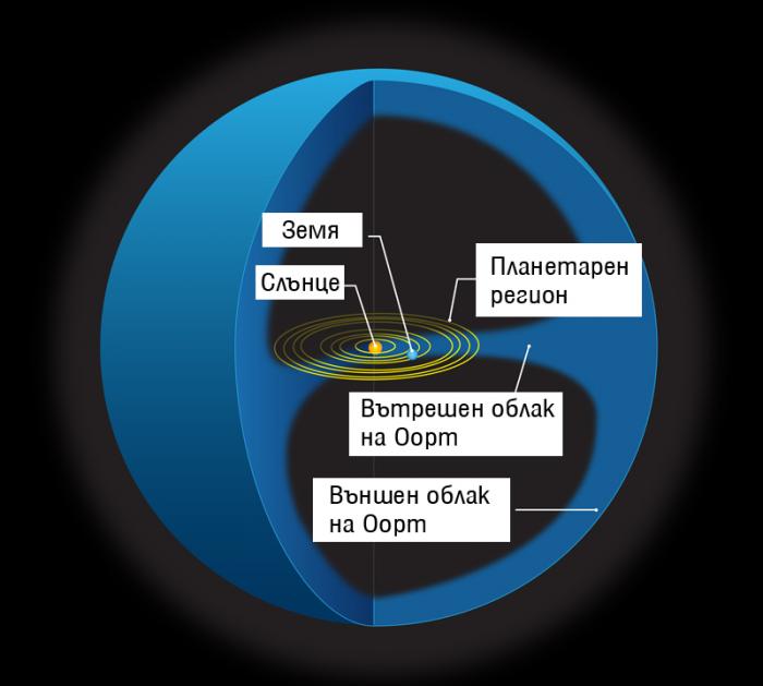 Хаос царува на 50 000 AU от Земята (1 AU е разстоянието между Земята и Слънцето). На това разстояние, в студените дълбини на нашата Слънчева система, откриваме Облака на Оорт. На малко над 7,4 трилиона км от слънчевата повърхност, плътният облак очертава хипотетичната граница на влияние на Слънцето.