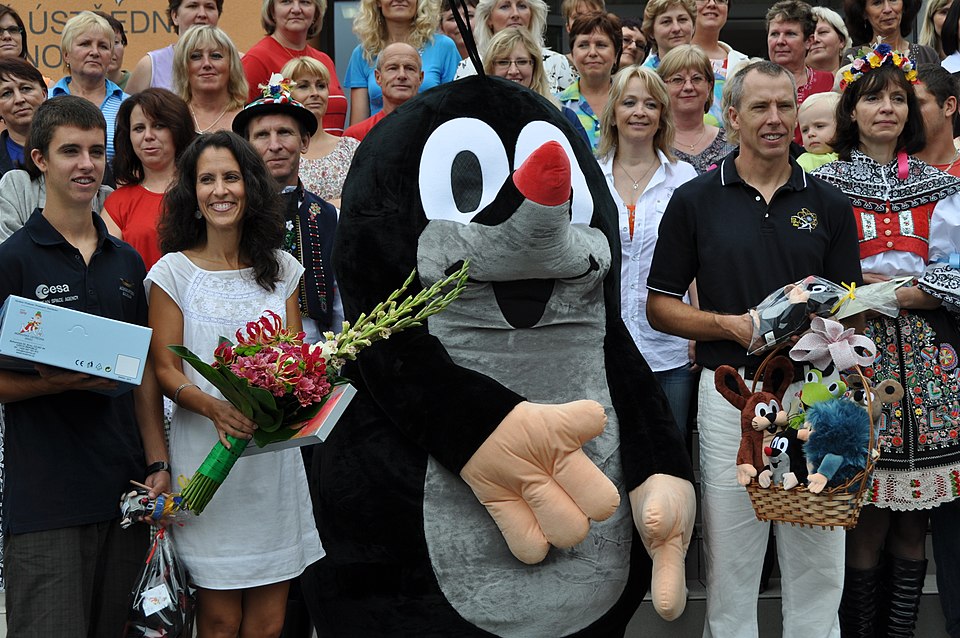Плюшената фигура на Къртичето по време на промоционално събитие, заедно с астронавта Ендрю Фойстъл и семейството му, 2011 г. (Credit: Janahenych, CC BY-SA 4.0, via Wikimedia Commons)
