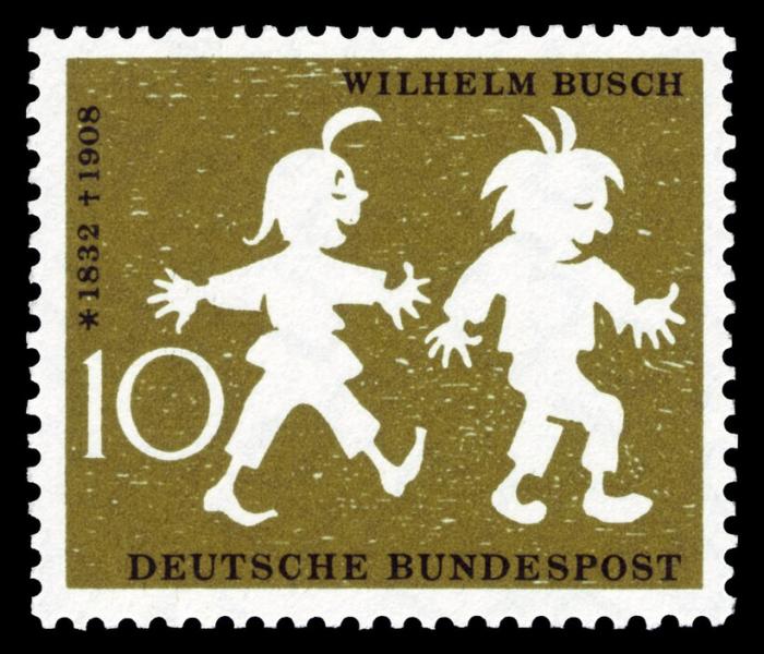 Възпоменателна марка от Германската федерална поща по случай 50-годишнината от смъртта на Вилхелм Буш през 1958 г. (Credit: scanned by NobbiP, Public domain, via Wikimedia Commons)