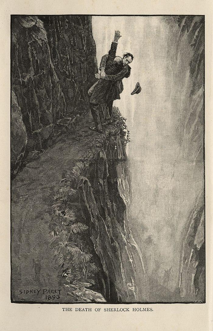 В разказа на Конан Дойл на 4 май 1891 г. край водопада Райхенбах възниква физически сблъсък между Холмс и проф. Мориарти, който приключва, както се предполага от доктор Уотсън (приятел и сътрудник на Холмс, който се явява повествувател в разказа) със смъртта на двамата противници.