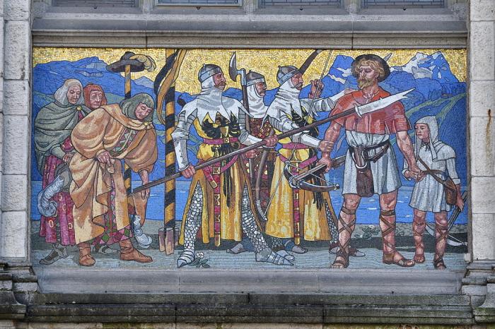 Арестът на Тел близо до Геслерхут, мозайка от Ханс Сандройтер (1901) (Credit: Hans Sandreuter; photograph: Roland zh, CC BY-SA 3.0,