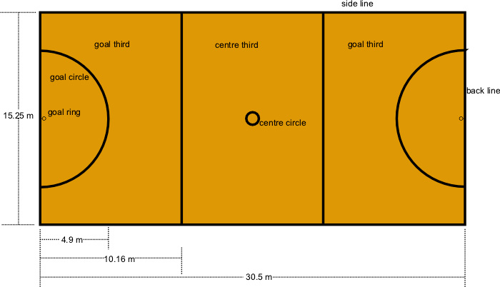 Игралното поле е с размери 15,25 м на 30,5 м и е разделено на три отделни зони (или „третини“). От двете страни на игрището има полукръгли зони – „кръгове за стрелба“ – с радиус 4,9 м.