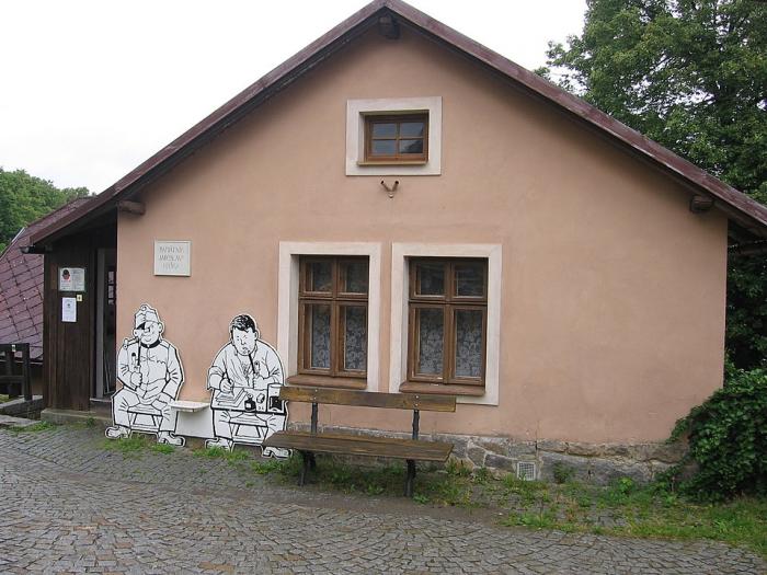 Паметникът на Ярослав Хашек в къщата му в Липнице над Сазавоу. Отдясно до писателя е „седнал“ Швейк. (Credit: Jik jik, CC BY-SA 3.0, via Wikimedia Commons)