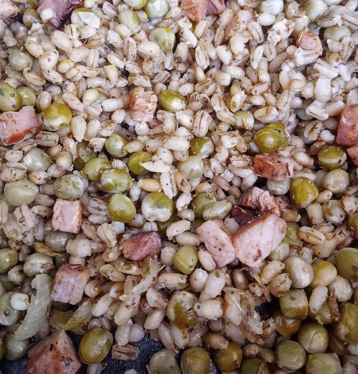 3. В дълбок тиган пържете лука в свинска мас. Когато стане прозрачен, добавете бекона и го пържете до златисто кафяво. Добавете чесъна, майораната, кимиона, солта, сварения грах и булгура, задушавате ги леко и ястието е готово.