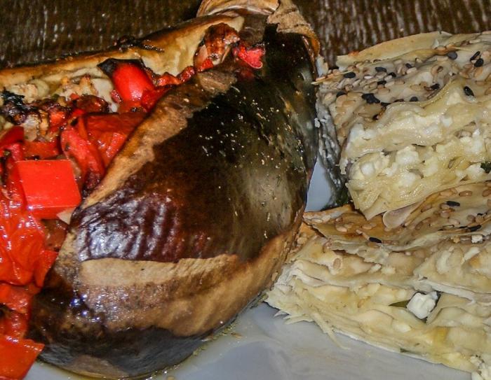 Имамбаялдъ (вляво), сервиран с бюрек (Credit: seelensturm, CC BY 2.0, via Wikimedia Commons)