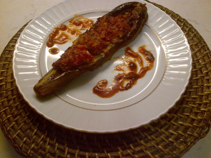 С нож направете правоъгълник в центъра на всеки патладжан, след което намачкайте месестата част с вилица. Поставете патладжаните в тава за гратен. Напълнете обилно всеки патладжан. Налейте малко вода и олио на дъното на тавата. Печете в предварително загрята фурна на 180°C (350°F) за 25–30 минути. Сервирайте студени или топли, поръсени с магданоз.
