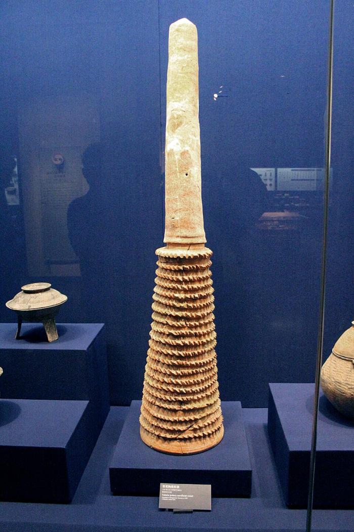 Тръбен керамичен жертвен съд. Открит в Дендзяван, Тиенмън през 1987 г. Реликва от културата Шидзяхе. Музей на Хубей, Ухан. (Credit: Prof. Gary Lee Todd, CC BY-SA 4.0, via Wikimedia Commons)