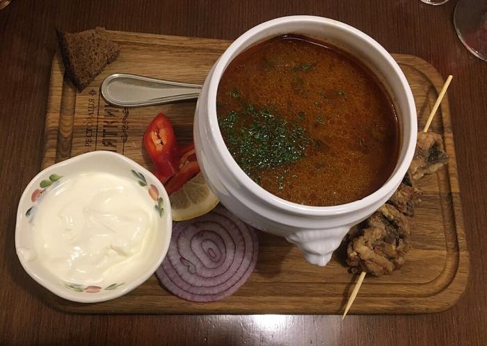 Рибна солянка. Ресторант „Пяткин“ (Нижни Новгород): Солянка от различни видове риба, сервирана с каракуда, 2020 г. (Credit: Eraevsky, CC BY-SA 4.0, via Wikimedia Commons)