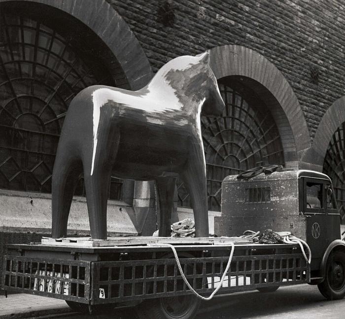 Конят Дала, предназначен за шведския павилион на Световното изложение в Ню Йорк през 1939 г. на път за декориране. (Credit: Erik Holmén, CC BY-SA 4.0, via Wikimedia Commons)