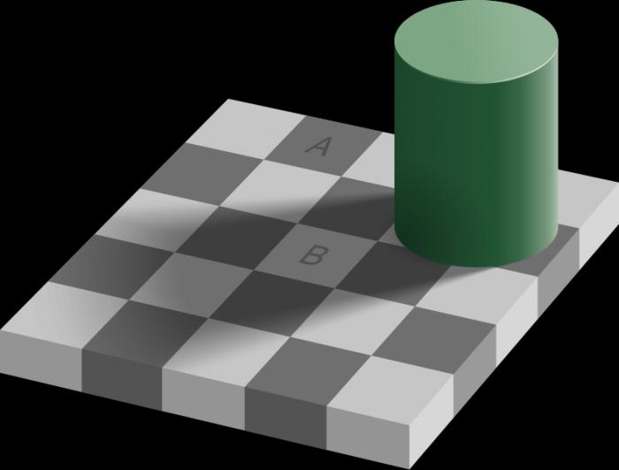 Шахматните полета А и B са с еднакъв цвят. (Credit: Original: Edward H. Adelson, vectorized by Pbroks13., CC BY-SA 4.0,